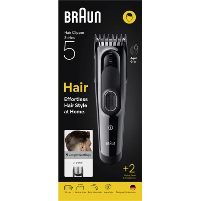 Braun Hair Clipper Series 5, +2 Styling Tools, Lifetime Sharp Blade, 9 Lengths, HC5510, Black