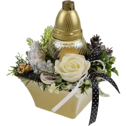 Preparation for a prayer corner in a bowl with a rose and a candle
