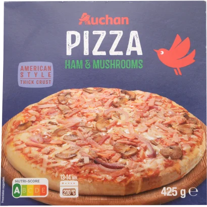 Auchan Kedvenc vastag tésztájú sonkás-gombás pizza, gyorsfagyasztott 425 g