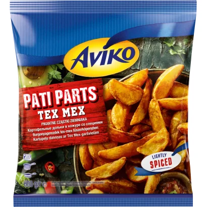 Aviko Pati Parts Tex Mex elősütött, gyorsfagyasztott burgonyagerezdek tex-mex fűszerköpenyben 600 g