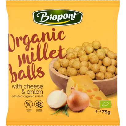 Biopont gluténmentes bio sajtos-hagymás ízesítésű extrudált kölesgolyó 75 g
