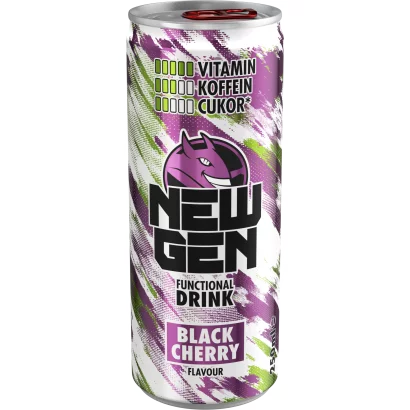 New Gen fekete cseresznye- és tuttifruttiízű, koffeintartalmú, szénsavas, alkoholmentes ital 250 ml