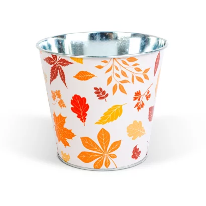 Őszi dekor, fém kaspó, leveles